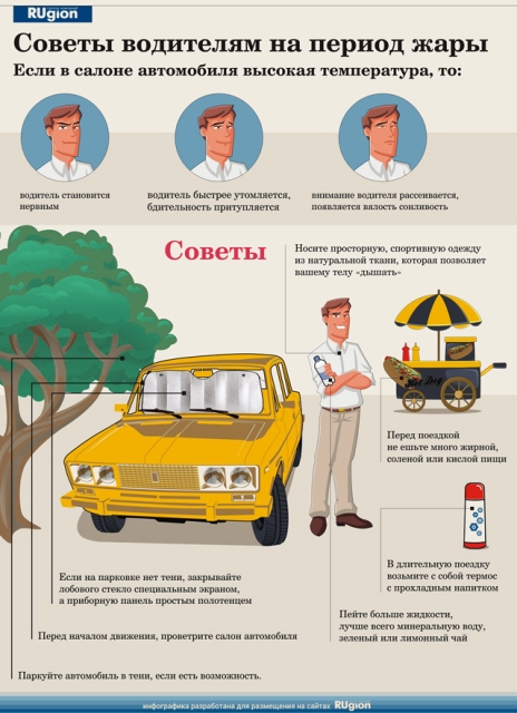 Если почувствуете недомогание или перегрев – остановитесь в тени и отдохните. Выйдите из-за руля, пройдитесь, откройте в автомобиле все окна и, только убедившись, что чувствуете себя удовлетворительно, продолжайте движение. Ни в коем случае не оставляйте детей в закрытом автомобиле.